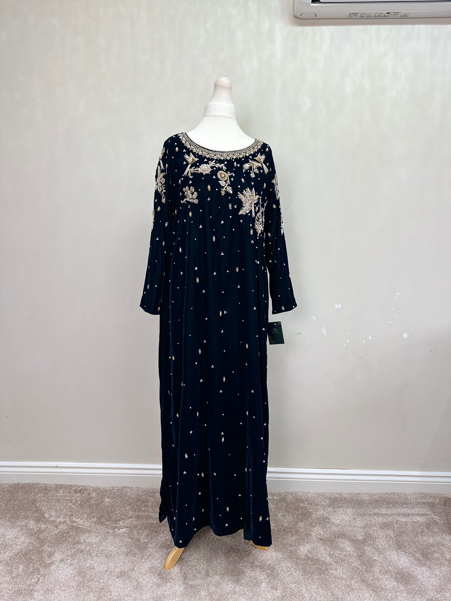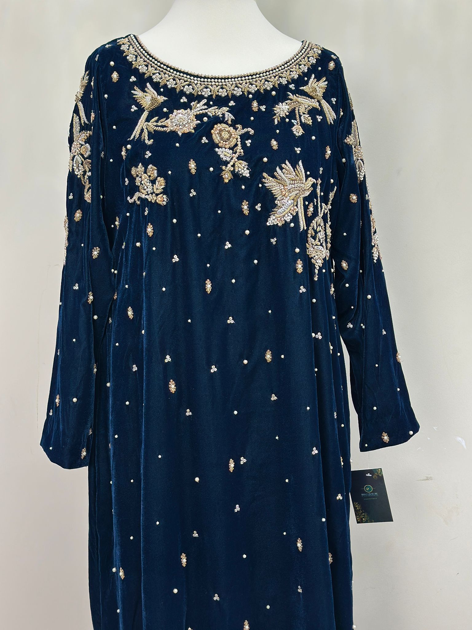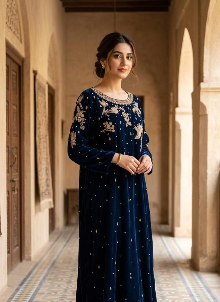 Thisone piece dress has Velvet fabric with hand zardozi work on front. Highlights both the vibrant, high-voltage color and sharp, modern tailoring.
