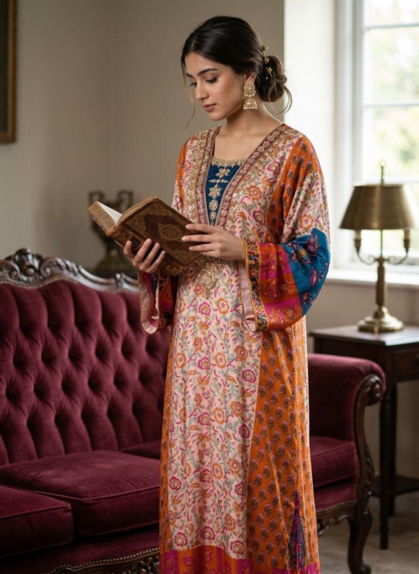 This one piece dress has pure chemuse fabric with hand zardoi work . A striking option for an artsy gallery opening, a fashion event, or a night out.